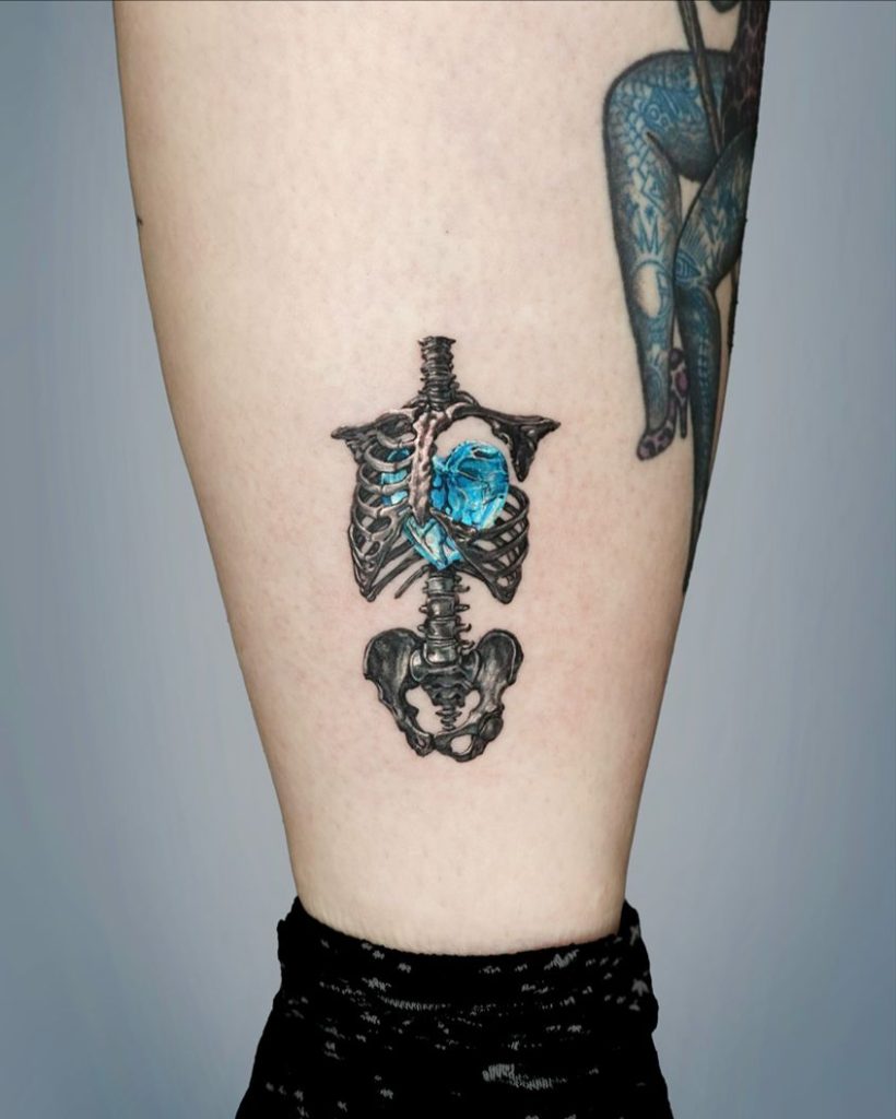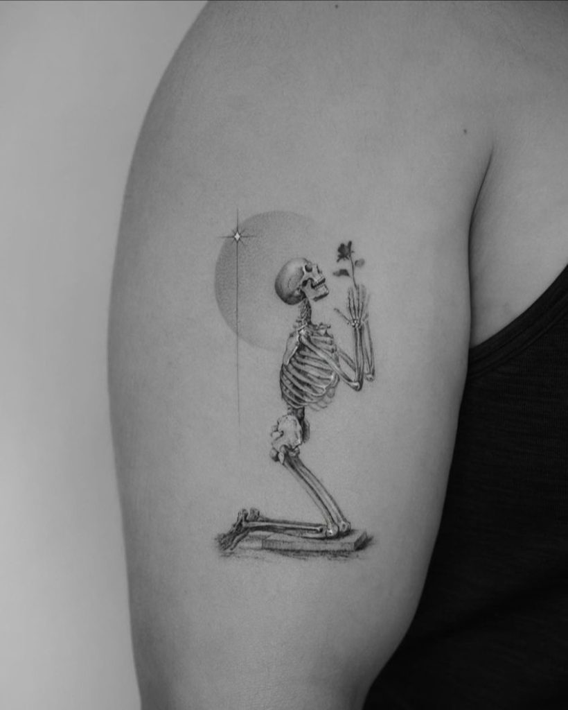 Here are more skeleton tattoo designs that blend darkness, beauty, and deep meaning. From surreal compositions to softer, feminine styles that incorporate flowers and gems, each piece carries its own emotional depth and artistic expression. Explore the designs below for inspiration.