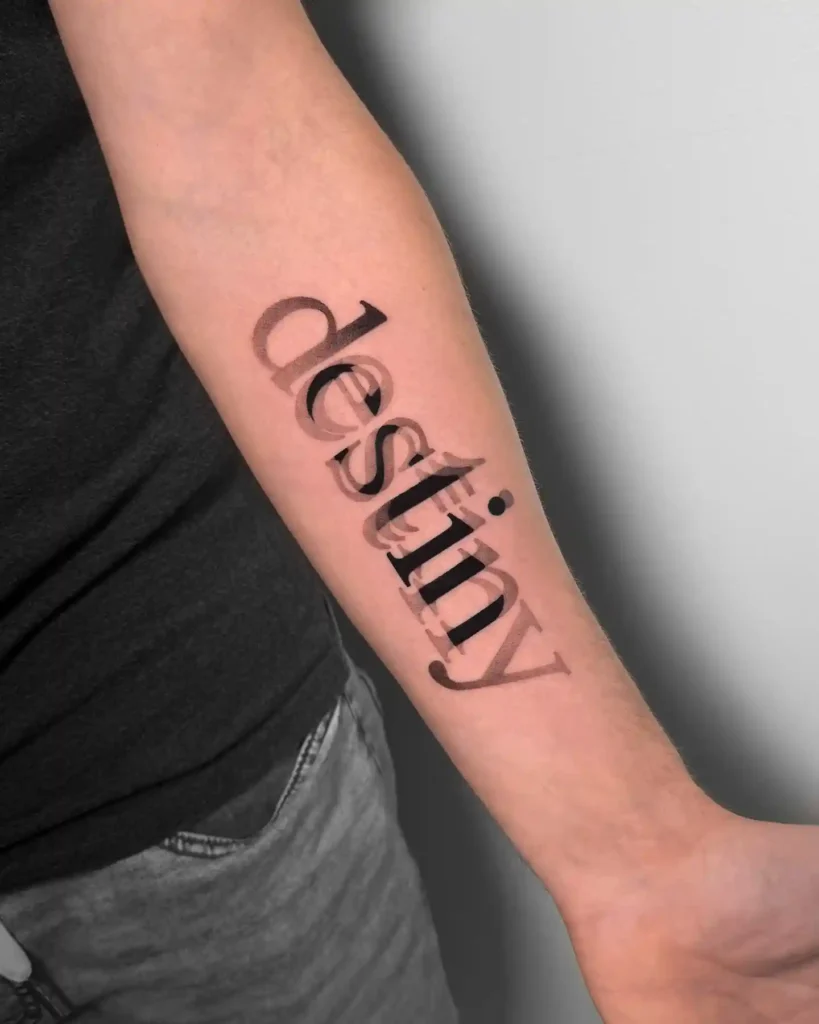 This forearm tattoo says “destiny” in a classic serif font with the faded shadow effect, making the letters appear to have a slight echo. “Destiny” refers to a predetermined course of events. The elegant font gives the word a sense of timelessness and fate.
